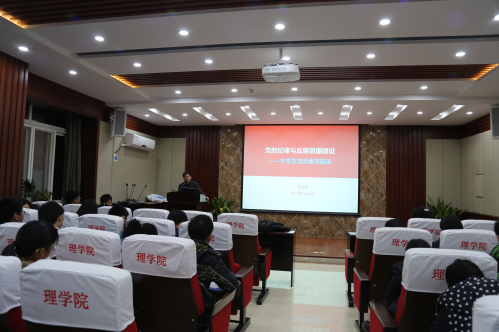 随后,院党委书记李金发为全体党课学员和党员带来题为“党的记录与反腐倡廉建设――大学生党员素养随谈”的主题报告,他首先从“优秀党员的要求”入手,通过讲解破窗效应警醒大家,廉洁自律,公私分明。之后,他从“大学生党员的纪律与规矩”、“大学生党员的责任与担当”、“大学生党员的素养与情怀”三个小专题,结合大学生实际情况,强调大学生党员应从严从实要求自己,以孔孟之道为本,修身立德,养性养心,保持良好状态,争做模范先锋。会上,在谈及大学之道时,李金发指出大学之道在于明德修己,亲民治人,止至善,修身必要立德,养性先得养心,在大学应树立正确价值观,淡泊名利,养身养心。最后,李金发用“逆商”和“动商”诠释了国家和社会对21世纪大学生党员的基本要求。并附以对联“立定脚跟竖起背,展开眼界放平心”对学员们提出希望和要求。