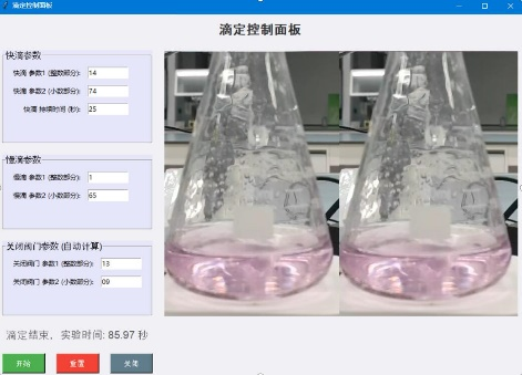 代表队直面挑战,多次改进实验方案,修改程序代码。最终成功解决了扩散时残留颜色问题,同时突破性地解决了背景颜色对滴定终点颜色识别的干扰,并自主设计滴定控制面板,大大降低了对于滴定速度控制的难度。并基于该面板优秀的速度调节功能,采用快慢滴结合的方式,在提高了滴定效率的同时保证了滴定的准确度。