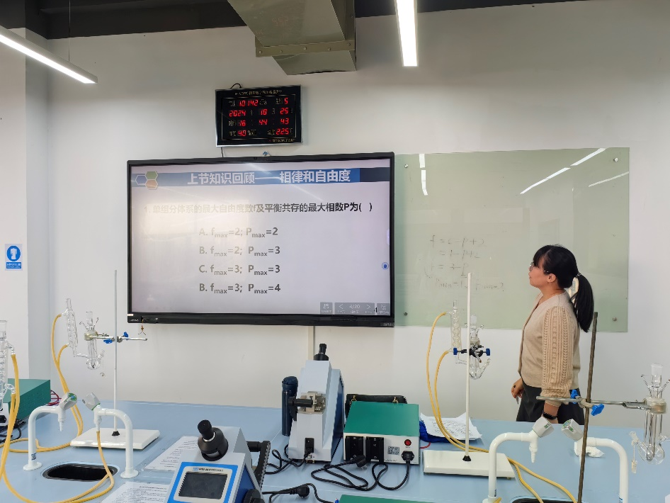 丁聪老师以生活中的实例为引子,深入浅出地讲解了水的相图概念以及其在科研和实际应用中的重要性。通过精美的PPT和生动的讲解,将复杂的相图知识变得易于理解,激发了学生们的学习兴趣和探索精神。丁聪老师还巧妙地设计了互动环节,引导学生们积极参与讨论和思考。她鼓励学生们提出自己的疑问和见解,通过师生间的互动,使课堂氛围更加活跃,学生们的学习效果也得到了显著提升。