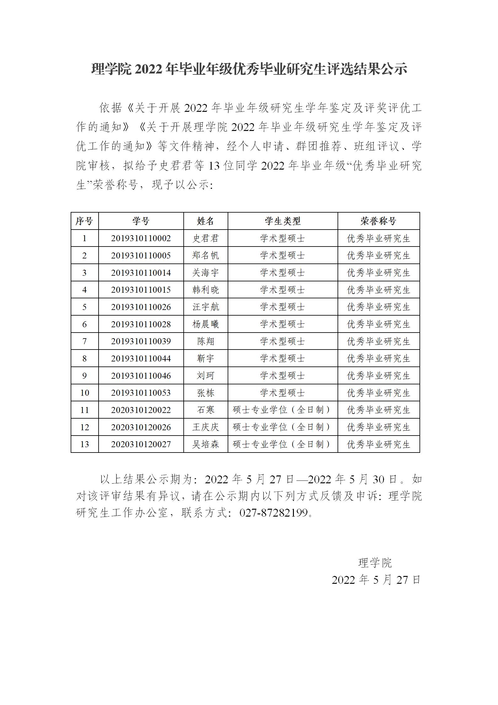 理麻豆在线 2022年毕业年级优秀毕业研究生评选结果公示