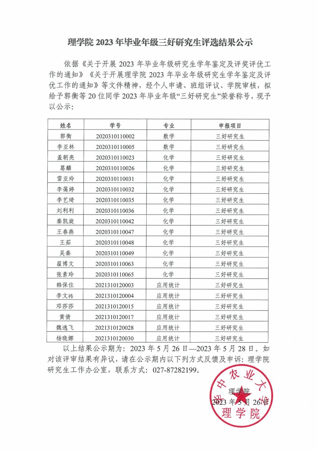 理麻豆在线 2023年毕业年级三好研究生评选结果公示