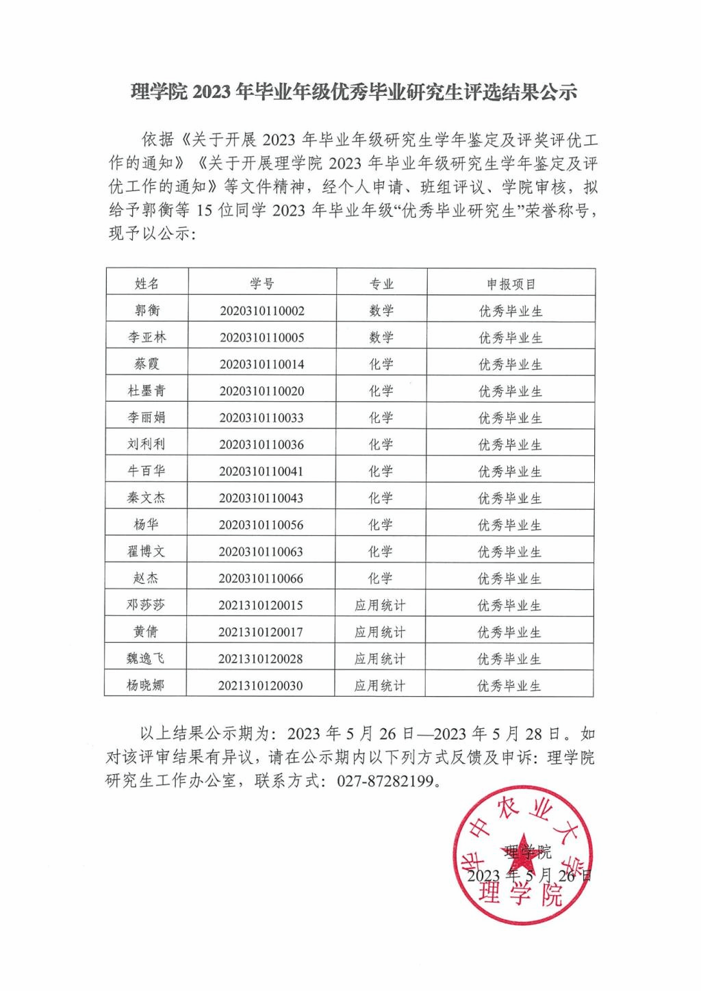理麻豆在线 2023年毕业年级优秀毕业研究生评选结果公示
