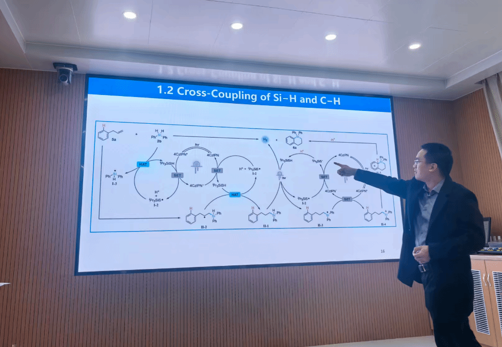 报告会上,周荣老师围绕无金属参与氧化性自由基-极性交叉的放氢偶联及氧化反应展开深入讲解。与会师生围绕报告内容展开热烈讨论,交流聚焦于自由基反应机理、极性交叉路径的调控策略,以及无金属催化体系在绿色合成中的拓展应用等问题,现场讨论热烈,互动频频,学术氛围浓厚。