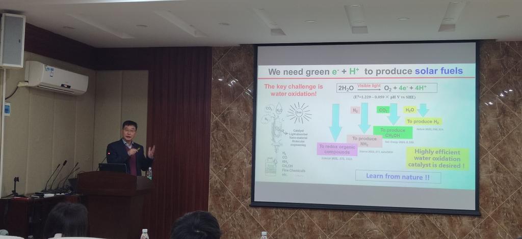 报告中,孙立成教授就人工光合作用的关键科学问题,即高效水氧化催化剂设计合成、氧-氧键形成机理,以及光解水制氢功能器件设计与材料制备等热点问题,结合已发表的多篇优秀工作进行了生动形象的讲解。
