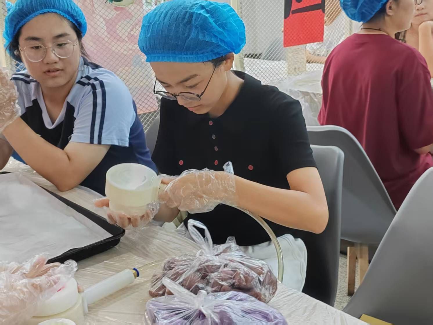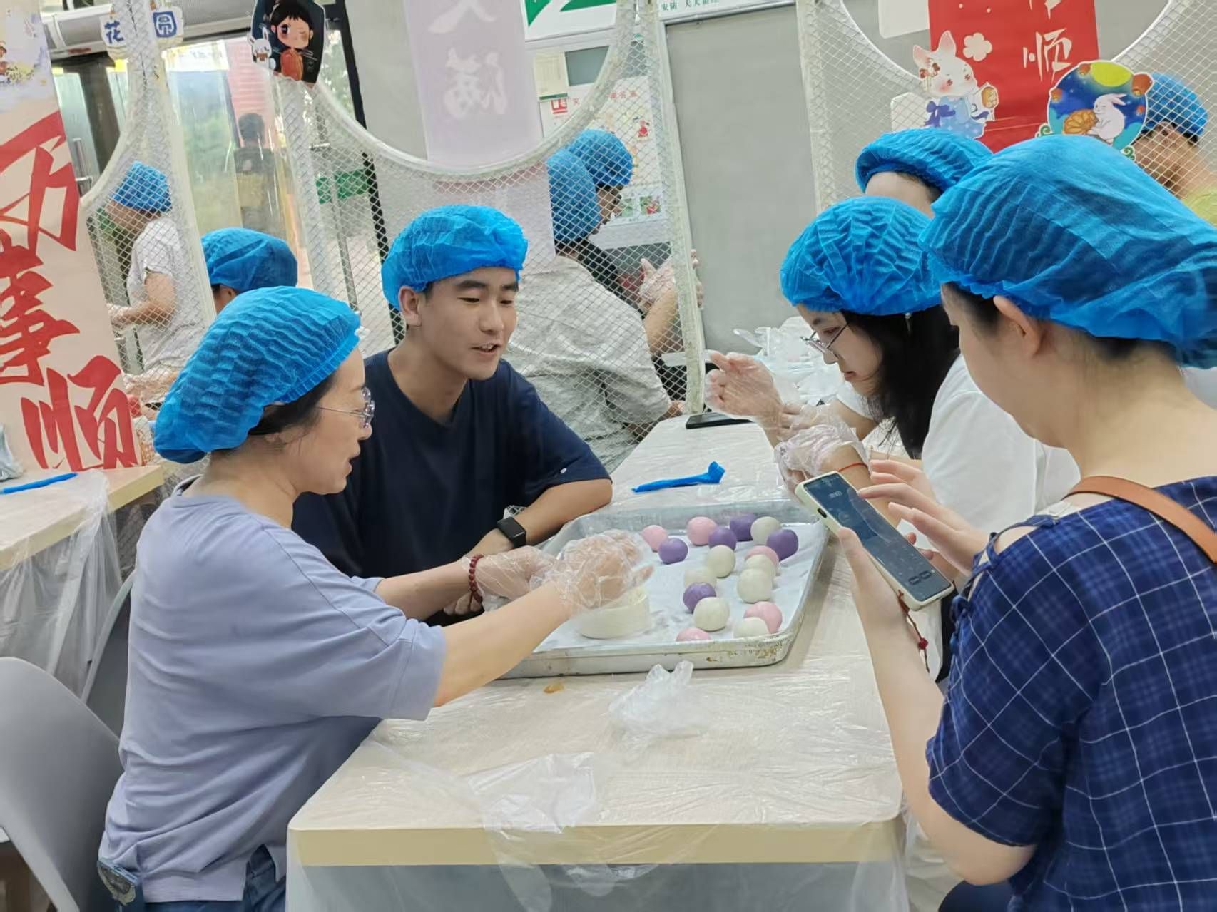 操作台上,互帮互助的画面格外暖心。有经验丰富的老师主动指导身边的学生:“饼皮要捏薄一点,不然内馅露不出来味道”;学生们也互相分享小技巧:“揉面团的时候加点力,月饼成型会更漂亮”。工作人员则穿梭在人群中,及时为大家补充物料、解决问题 —— 有人找不到模具时,他们迅速帮忙递送;有人内馅放太多导致饼皮破裂时,他们耐心指导补救方法。更令人动容的是,活动中还有老师带着小朋友参与,孩子们在家长的帮助下,笨拙却认真地揉着面团,小小的手握着模具,脸上满是好奇与期待,亲子协作的温馨场景,为活动增添了别样的温情与童趣。