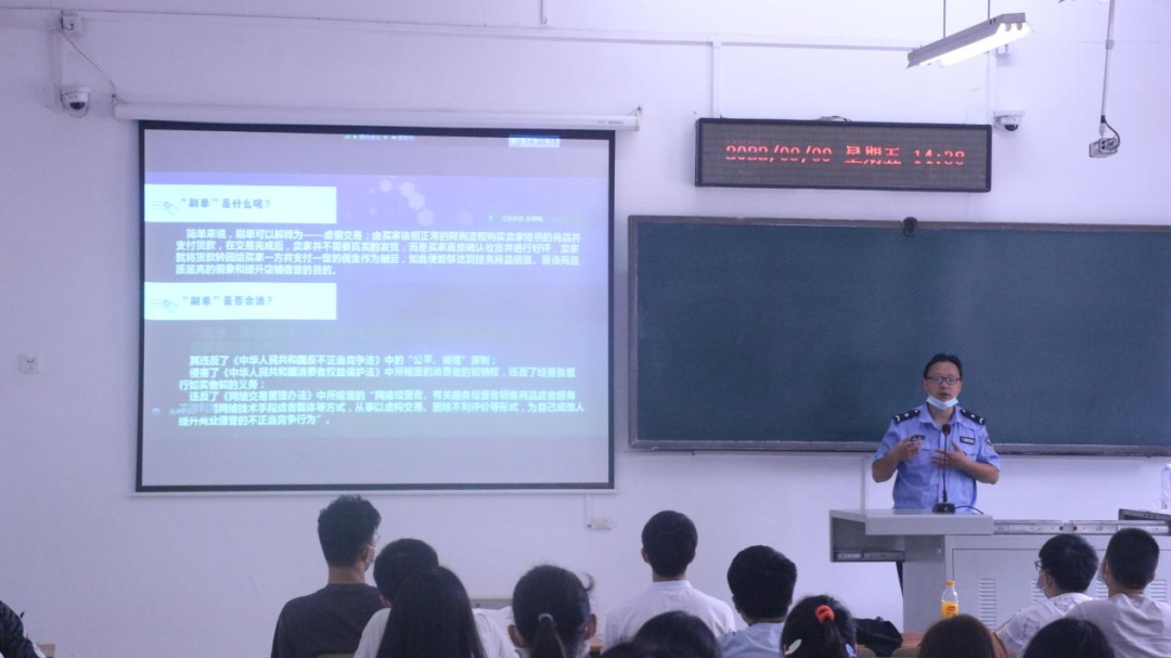 邀请了南湖派出所民警郭锋为全院学生开展防诈骗安全教育,近日,讲座在三教以“主会场+分会场直播”的形式顺利举办。