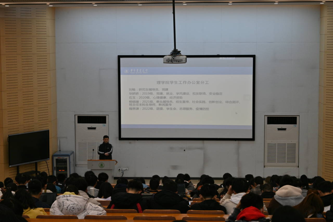 辅导员程思源根据前期调研的情况,回应了同学们在思想、学习等方面的困惑,对同学们提问较多的共性问题进行了分析和解答。接下来,他以辅导员的九大工作职责为切入点,向同学们强调遇到问题要及时联系辅导员、班主任。
