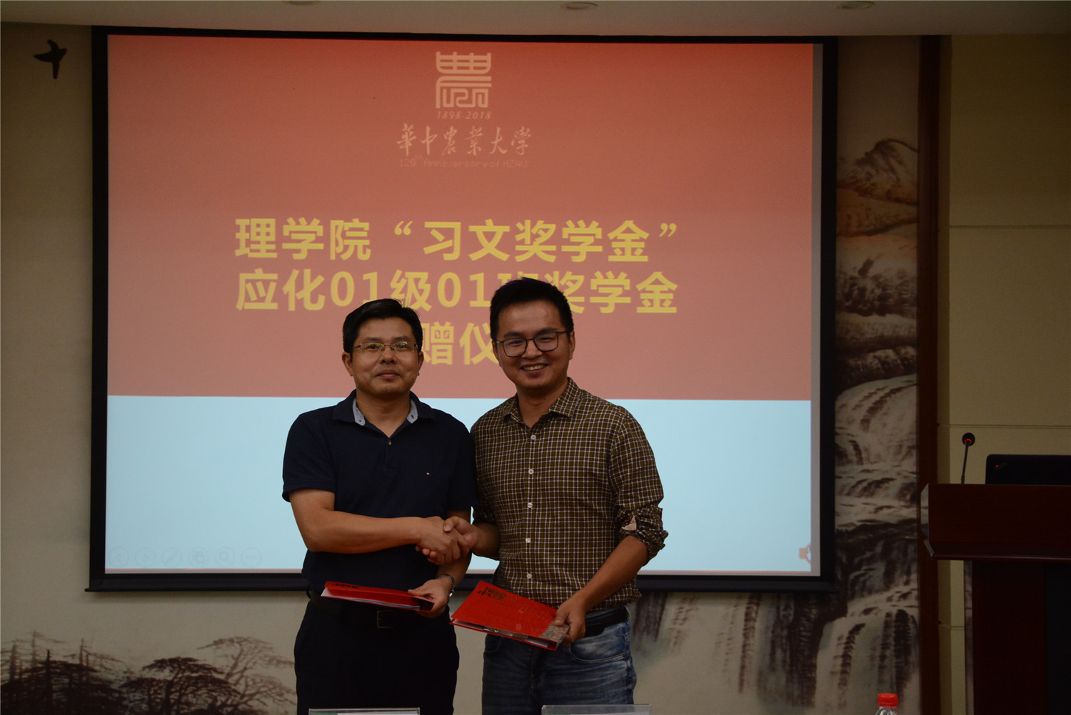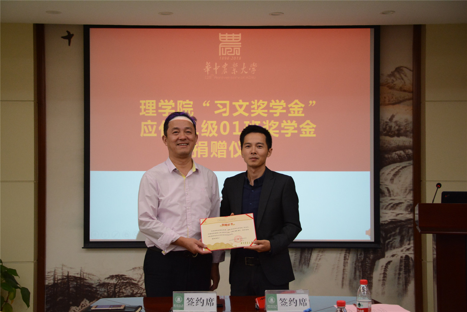 “习文奖学金”、应化01级01班奖学金捐赠仪式在逸夫楼B212举行。校友许习文,应化01级01班代表项勇刚,学校校庆工作办公室副主任付军,理麻豆在线