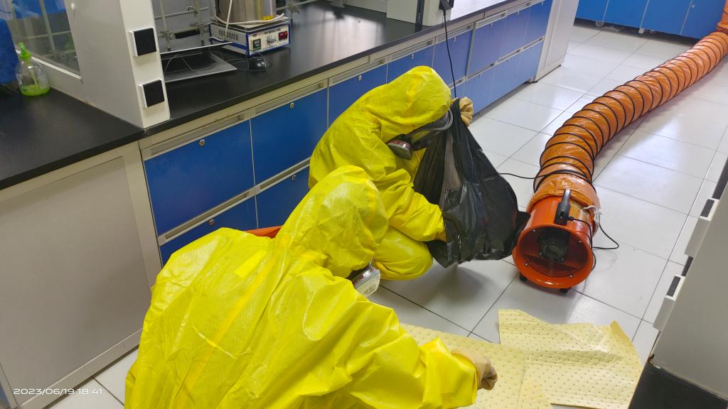 建安部安全管理办公室主任雷建华担任应急演练小组的总指挥、化学系副主任马忠华担任应急演练小组副总指挥,化学英才班全体同学参与本次演练。危化品泄漏、灼伤、中毒事故应急演练中模拟实验室浓硫酸泄露事故场景。演练开始,实验室立即启动危化品灼伤专项应急预案,现场人员按照实验室应急预案有序完成“紧急撤离、人员疏散、事故警戒、事故报告、应急处置、环境恢复、舆论控制”等应急处置的全流程进行了有序操作与演练。随后还进行了应急器材使用培训。