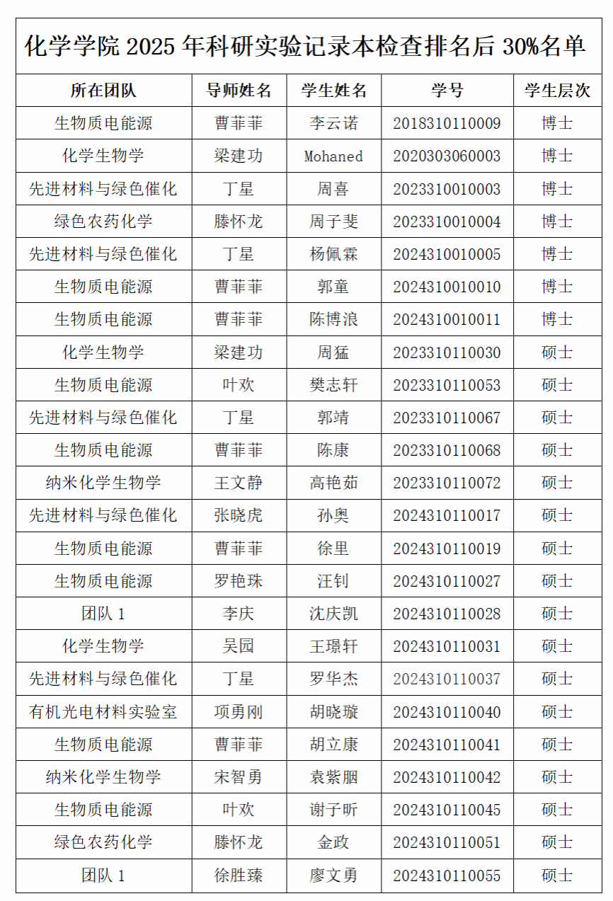 根据学校《关于常态化开展自然科学类研究生科研实验记录检查的通知》[校研务〔2025〕13号]要求,为进一步规范研究生科研实验记录管理、强化科研诚信建设,麻豆在线 于近期组织开展自然科学类研究生科研实验记录本专项审查工作。现将纳入学系和麻豆在线 两级审查范围的学生和导师名单公示如下: