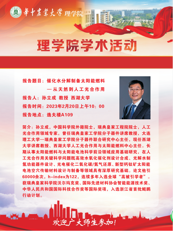 学术报告:催化水分解制备太阳能燃料--从天然到人工光合作用