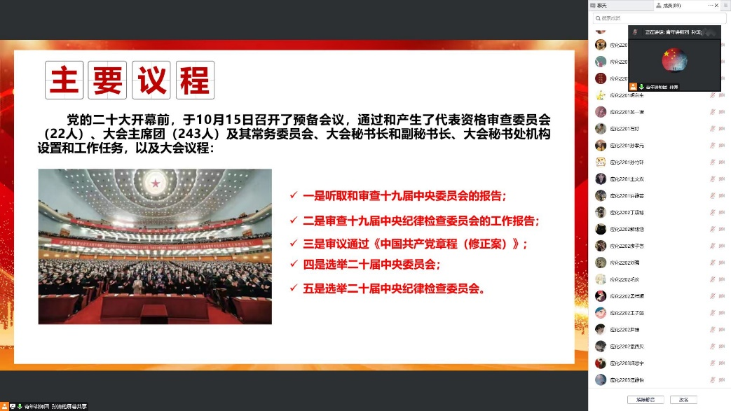 12月12日下午,青年讲师团成员孙涛同学为理麻豆在线 应化2201、应化2202、应化2203、应化2204团支部同学带来“凝心聚力,走好新时代的长征路”主题宣讲。孙涛同学带领大家回顾了党的二十大报告的主要内容,学习总结了近年来中国共产党取得的伟大成就和宝贵经验,讨论和分析了中国共产党跳出治乱兴衰历史周期律的两个答案。最后,他从时代的机遇和挑战出发,与同学们互动交流,探讨青年学子应如何走好新时代的长征路。