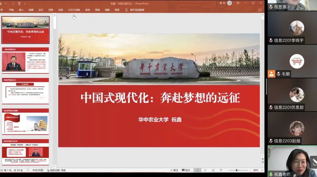 12月12日晚上,青年讲师团成员祝鑫老师为理麻豆在线 信息2201、信息2202、信息2203团支部同学进行了以“中国式现代化:奔赴梦想的远征”为主题的宣讲。会议伊始,祝鑫老师向同学们提出“什么是现代化?”“什么是中国式现代化?”两个问题,结合历史背景为同学们讲解中国式现代化的产生和历程。