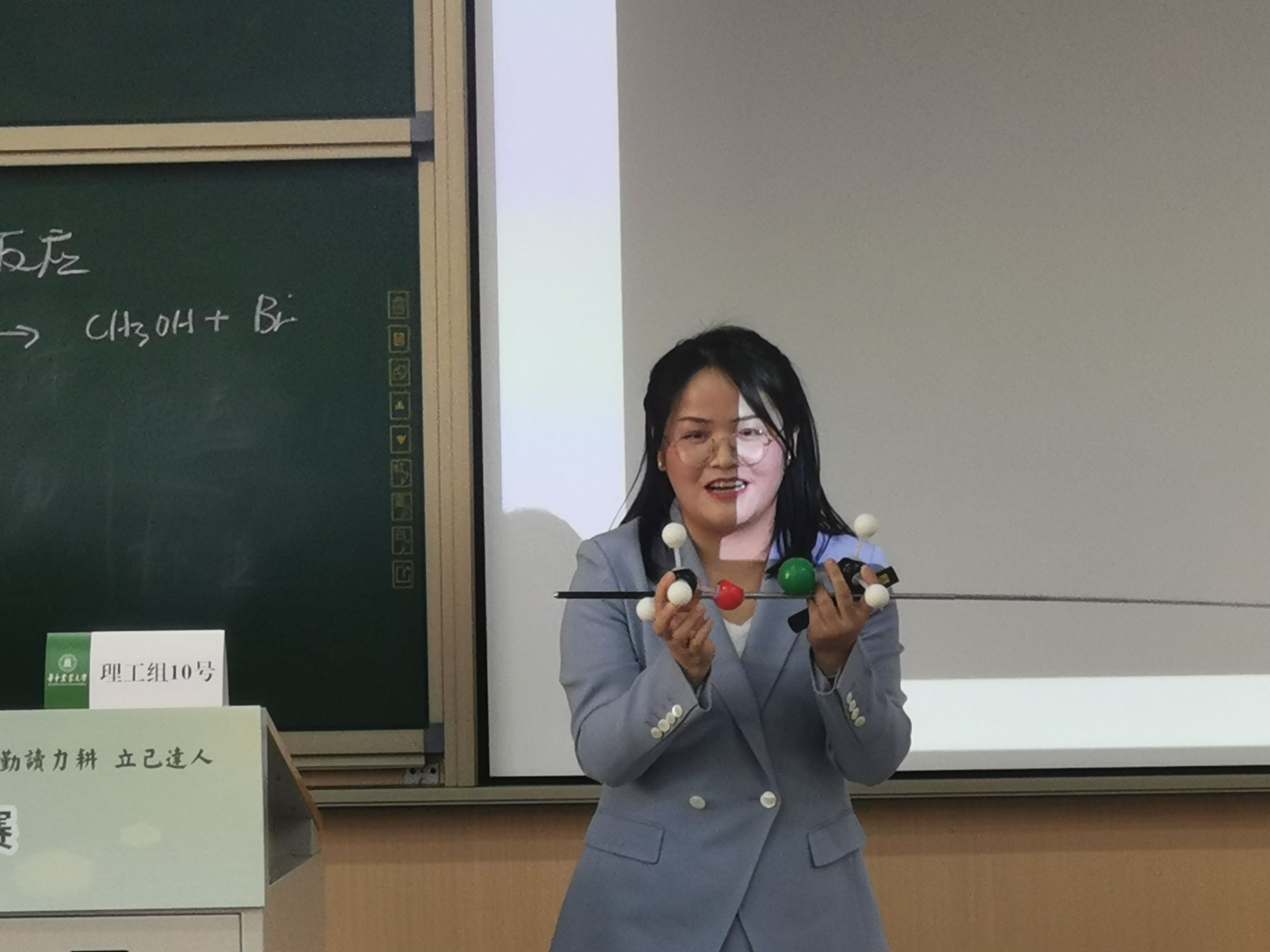 吴园的参赛课程《有机化学B》在20分钟课堂教学环节中,以授课专业密切相关的“如何化学合成D-丙氨酸”引出本堂课的教学内容,通过将重难点内容以问题链式探究法引导学生与学习内容互动,主动参与思考,培养学生自主学习能力。同时运用智慧课程24H智能学伴引导学生拓展深化内容,培养学生的审辨思维能力。在随后的反思答辩中,吴园从教学理念、教学内容创新和教学模式三方面分析课堂实施的效果。